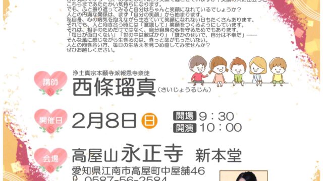 【中止】西條瑠真さん「人生円満生活」2/8(日)10時 永正寺『定期法話会』毎月8日開催 【講師の体調不良により、急ではありますが中止になりました】ご迷惑をおかけし申し訳ございません。 西條瑠真さん「人生円満生活」2/8(日)10時永正寺『定期法話会』毎月8日開催 定期法話会 お問い合わせは、永正寺(... 2026.02.04