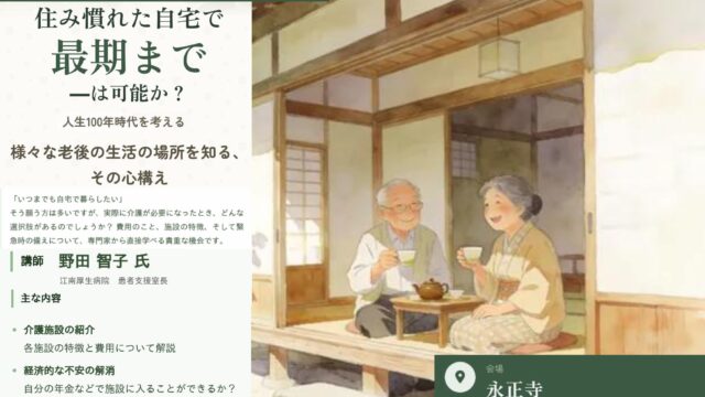 『住み慣れた自宅で最期まで~は可能か? 人生100年時代を考える』 3/8(日)13時【「ナナナナ・デザイン」毎月8日開催】 『住み慣れた自宅で最期まで~は可能か? 人生100年時代を考える』 3/8(日)13時 【「ナナナナ・デザイン」毎月8日開催】 住み慣れた自宅で最期まで~は可能か? 人生100年時代を考える 講師:野田 智子氏(... 2026.03.04