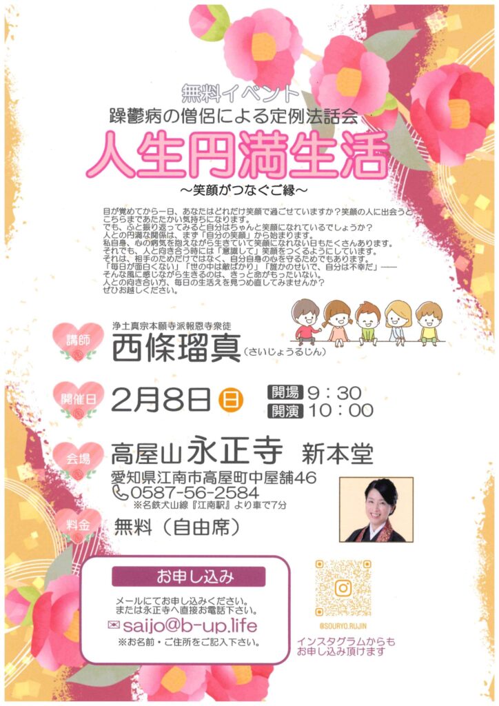 西條瑠真さん「人生円満生活」2/8(日)10時 永正寺『定期法話会』毎月8日開催 2026.02.04 西條瑠真さん「人生円満生活」2/8(日)10時永正寺『定期法話会』毎月8日開催 定期法話会 お問い合わせは、永正寺(0587-56-2584)へお願いいたします。