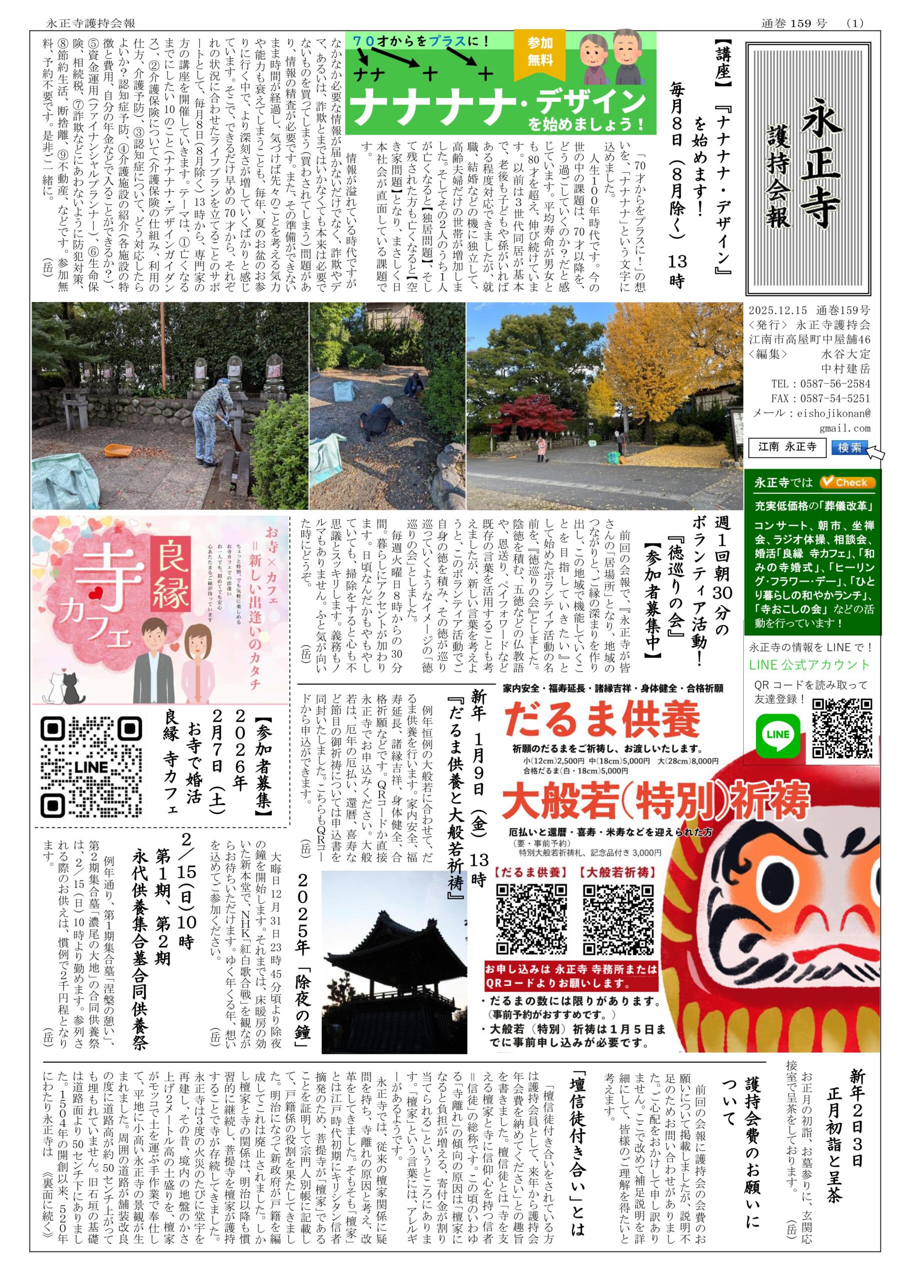 お知らせ Twitter Facebook はてブ Pocket LINE コピー 2022.12.29 2020.05.24 永正寺護持会報159号 永正寺護持会報159号ができました!是非ご覧くださいませm(_ _)m 私が書いているところは(岳)としてあり、大住職の場合は(定)としてあります。 お知らせ・会報 2026.01.19 永正寺護持会報158号 永正寺護持会報158号ができました!是非ご覧くださいませm(_ _)m 私が書いているところは(岳)としてあり、大住職の場合は(定)としてあります。 お知らせ・会報 2025.09.26 永正寺護持会報157号 永正寺護持会報157号ができました!是非ご覧くださいませm(_ _)m 私が書いているところは(岳)としてあり、大住職の場合は(定)としてあります。 お知らせ・会報 2025.09.26 永正寺護持会報156号 永正寺護持会報156号ができました!是非ご覧くださいませm(_ _)m 私が書いているところは(岳)としてあり、大住職の場合は(定)としてあります。 お知らせ・会報 2025.09.26 永正寺護持会報155号 永正寺護持会報155号ができました!是非ご覧くださいませm(_ _)m 私が書いているところは(岳)としてあり、大住職の場合は(定)としてあります。 お知らせ・会報 2025.09.26 永正寺護持会報154号 永正寺護持会報154号ができました!是非ご覧くださいませm(_ _)m 私が書いているところは(岳)としてあり、大住職の場合は(定)としてあります。 お知らせ・会報 2024.10.25 永正寺護持会報153号 永正寺護持会報153号ができました!是非ご覧くださいませm(_ _)m 私が書いているところは(岳)としてあり、住職の場合は(定)としてあります。 お知らせ・会報 2024.07.04 チケット販売開始しました!歌劇『道化師』~永正寺新本堂こけら落とし記念公演~ チケット販売開始しました!歌劇『道化師』~永正寺新本堂こけら落とし記念公演~ イベント詳細、チケット販売については⇒コチラ イベント・コンサート 2024.05.11 永正寺護持会報152号 永正寺護持会報152号ができました!是非ご覧くださいませm(_ _)m 私が書いているところは(岳)としてあり、住職の場合は(定)としてあります。 お知らせ・会報 2024.03.21 2/11(日)「良縁・寺カフェ」参加応募受付開始! 2/11(日)「良縁・寺カフェ」参加応募受付開始! 詳しくは⇒コチラから☆ ※正しくページが移り変わらない場合は、永正寺HPトップ画面より『イベント[…] お知らせ・会報 2023.12.13 1 2 3 … 29 次へ »